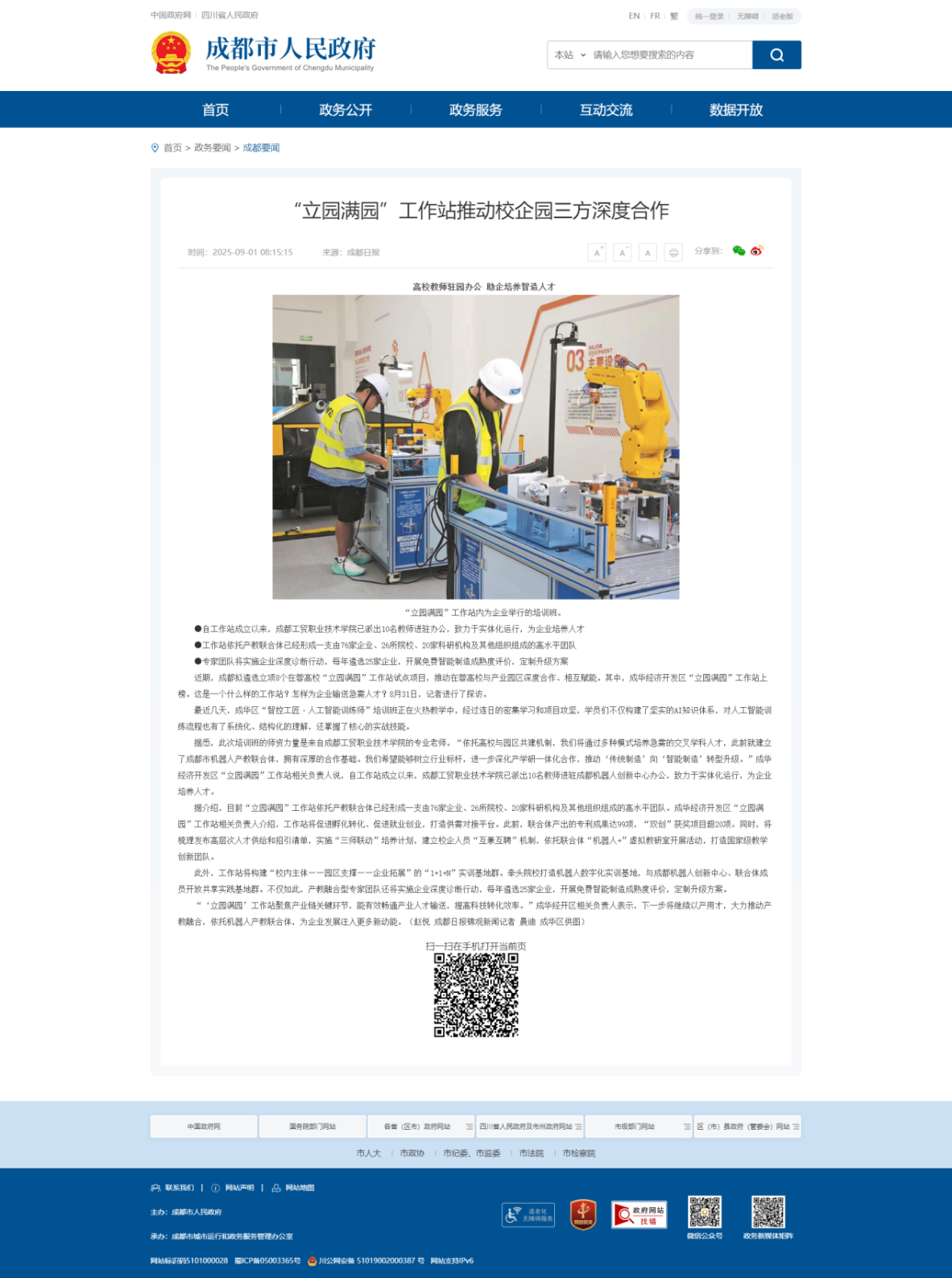此次获《成都日报》专题报道,是对我校长期以来坚持产教融合、服务地方发展办学理念的充分肯定。未来,学校将继续深化“立园满园”工作站建设,拓展合作领域,创新育人模式,为推动智能制造转型升级、培养高素质技术技能人才作出更大贡献。