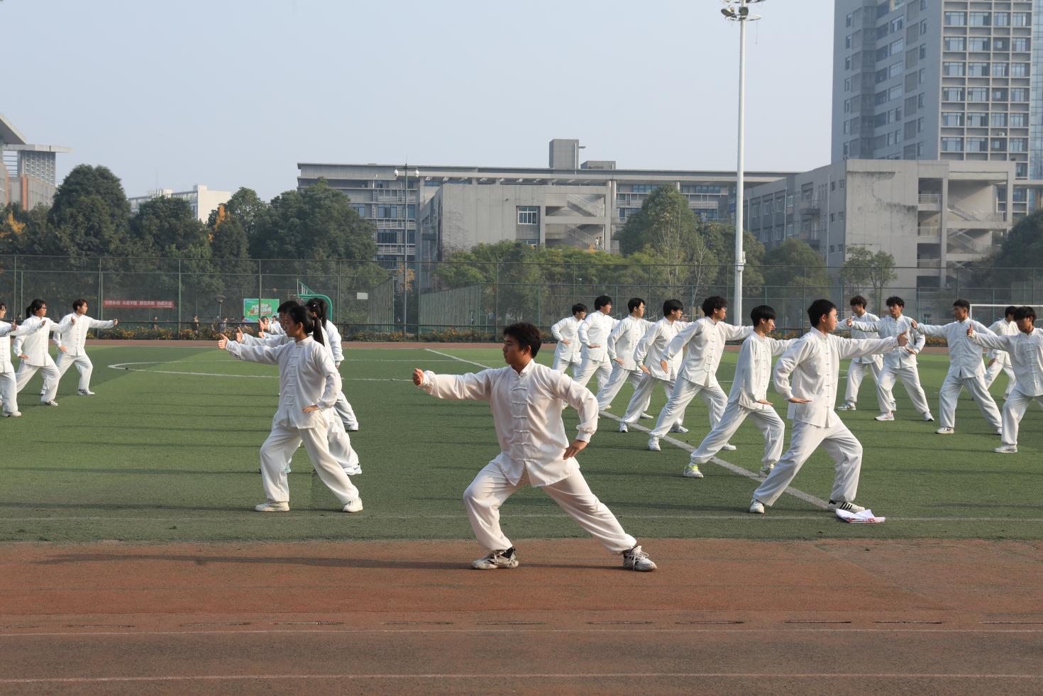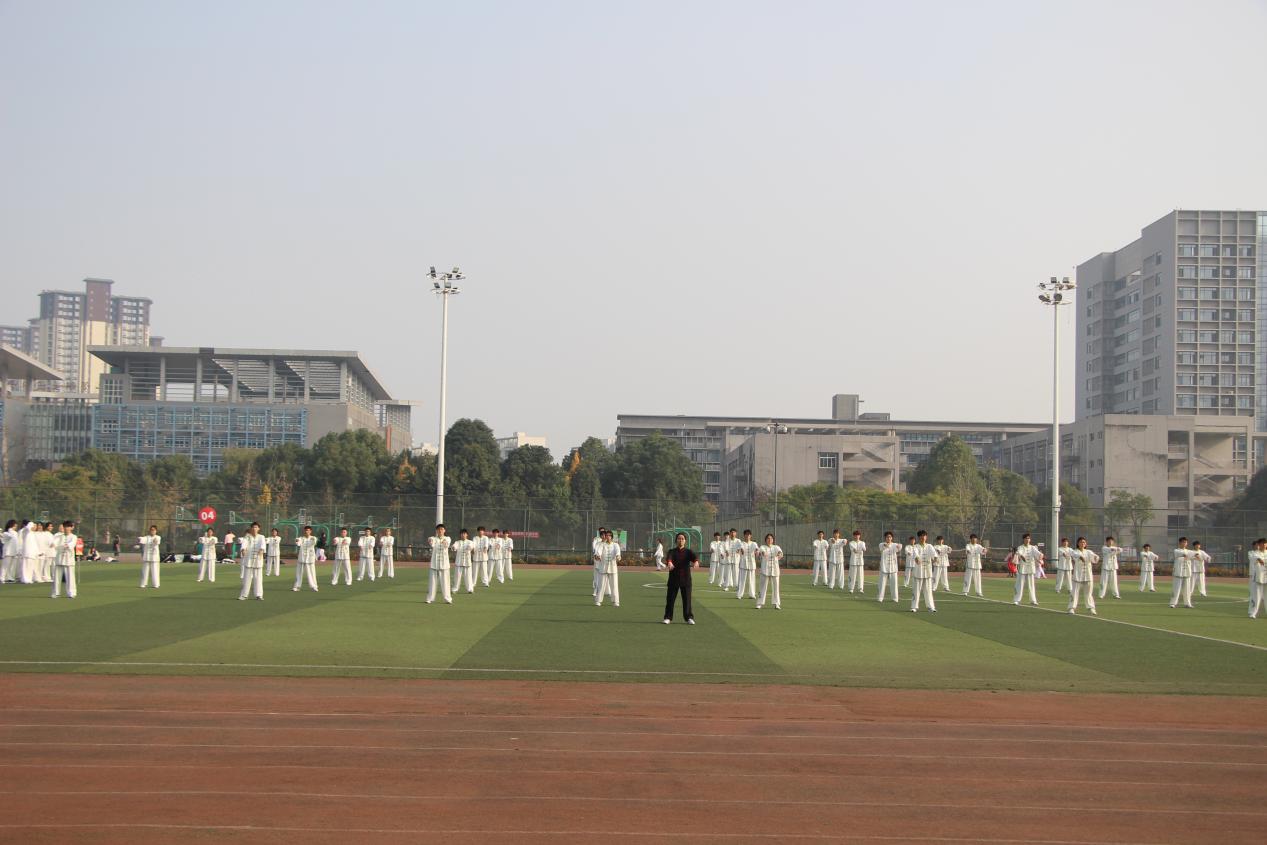 随后,郫都区社会体育指导员协会太极队献上了行云流水、刚柔并济的精彩表演,充分展现了太极拳的深厚底蕴与独特魅力,也为正式比赛拉开了序幕。在舒缓悠扬的乐曲中,来自全校7支队伍的380余名参赛学生依次登场。同学们凝神静气,起势、推手、云手、揽雀尾……一招一式之间,呈现出太极的柔美与张力,体现了力与美、动与静和谐统一的哲学意境。