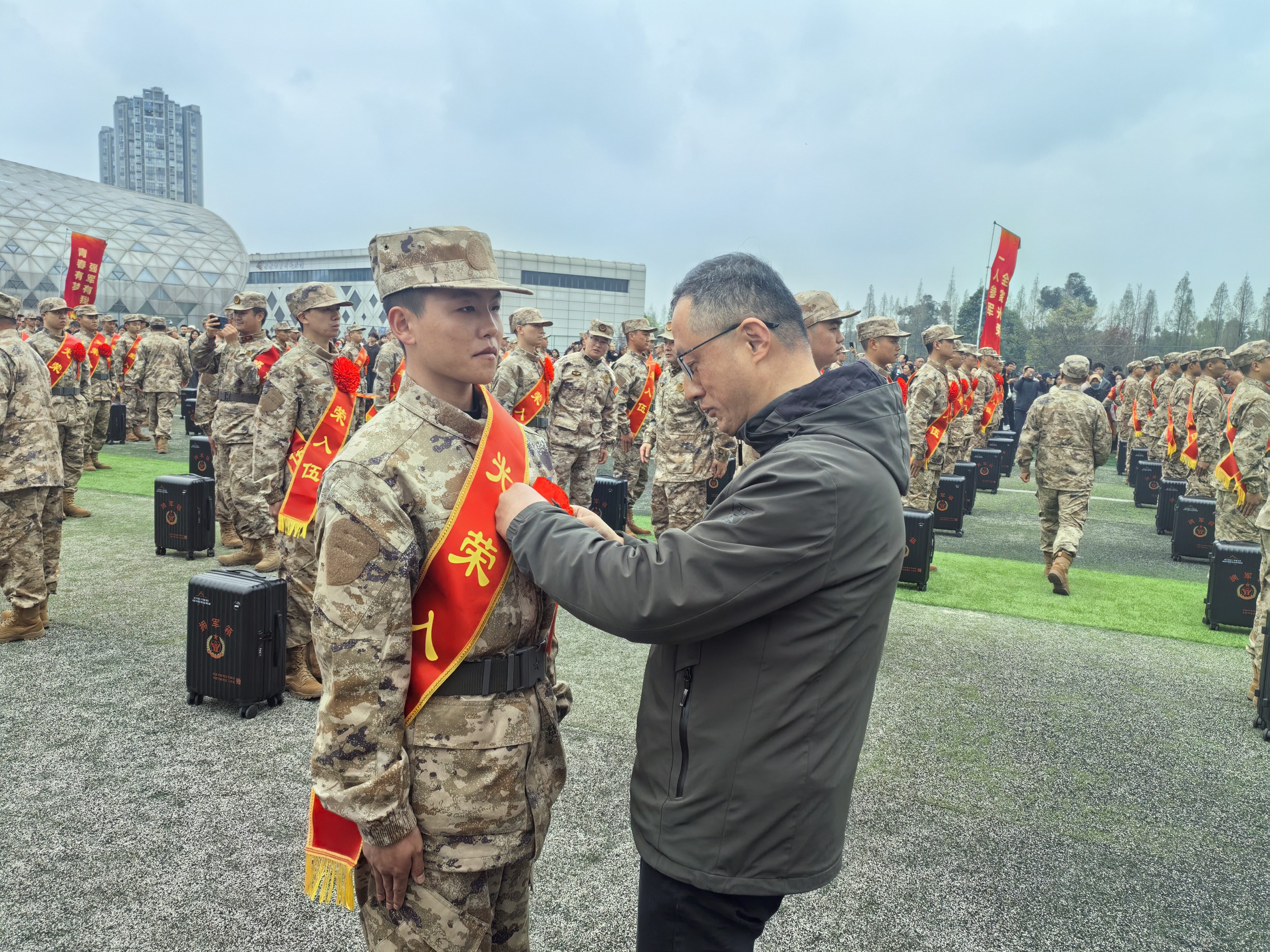 3月13日下午,郫都区2026年度上半年新兵入伍欢送仪式在区体育馆隆重举行。区委常委、区人武部上校部长李舸,区政府副区长、区公安分局局长罗佶出席仪式。我校党委武装部负责人及新入伍学生参加仪式
