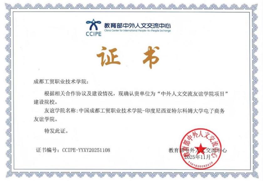 11月27日,2025年中外人文交流友谊学院项目工作总结暨推进会在广州召开。会议由教育部中外人文交流中心主办,汇聚国内外政府部门、高校的代表及相关领域专家学者共150余人。我校党委委员、副校长杜洁受邀出席会议并作专题发言。会上,教育部中外人文交流中心正式发布了2025年项目工作报告,各立项院校系统总结了“友谊学院”项目建设成效。我校于2024年立项的“中国—印度尼西亚电子商务友谊学院”经过一年的筹备建设,已于今年10月成功招收首届印度尼西亚籍学历留学生26人,并于11月20日在外方合作院校—印度尼西亚特尔科姆大学顺利揭牌。教育部中外人文交流中心对此给予了高度认可,并为我校颁发了“中外人文交流友谊学院”正式建设院校认证证书。在经验分享环节,杜洁以《“职教出海2.0”背景下成都工贸境外办学的实践探索》为题,系统介绍了我校“中国—印度尼西亚电子商务友谊学院”项目实践成果。她指出,学校紧扣在印尼电子商务领域中资企业对本土技能人才的核心需求,与项目共建单位创新构建了“校-校-企-企”四方协同育人机